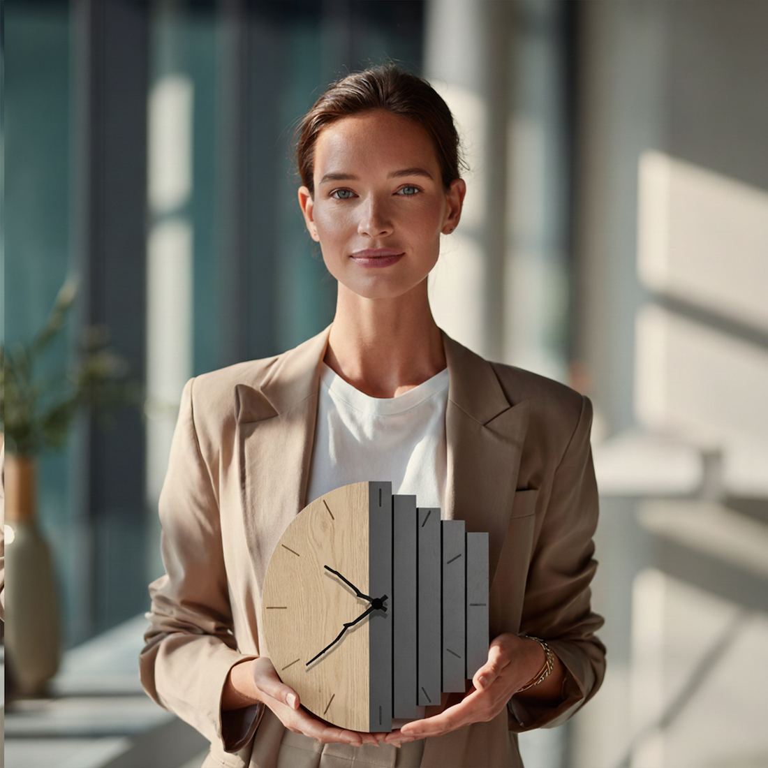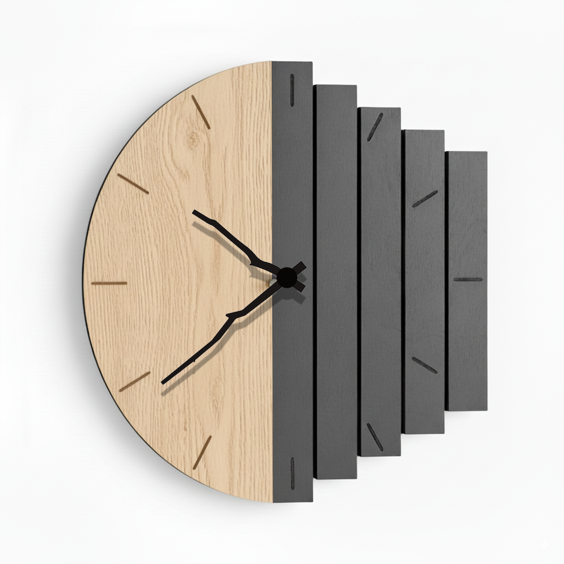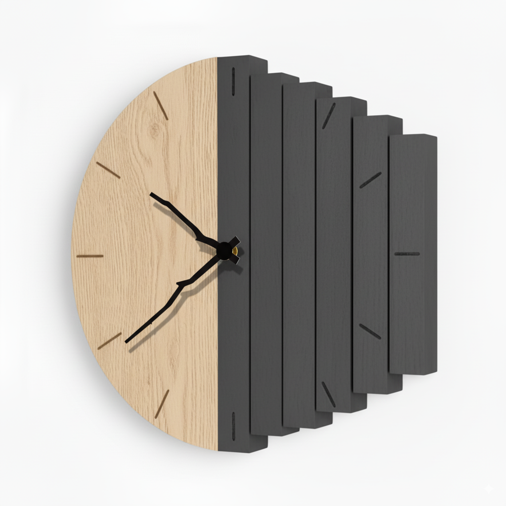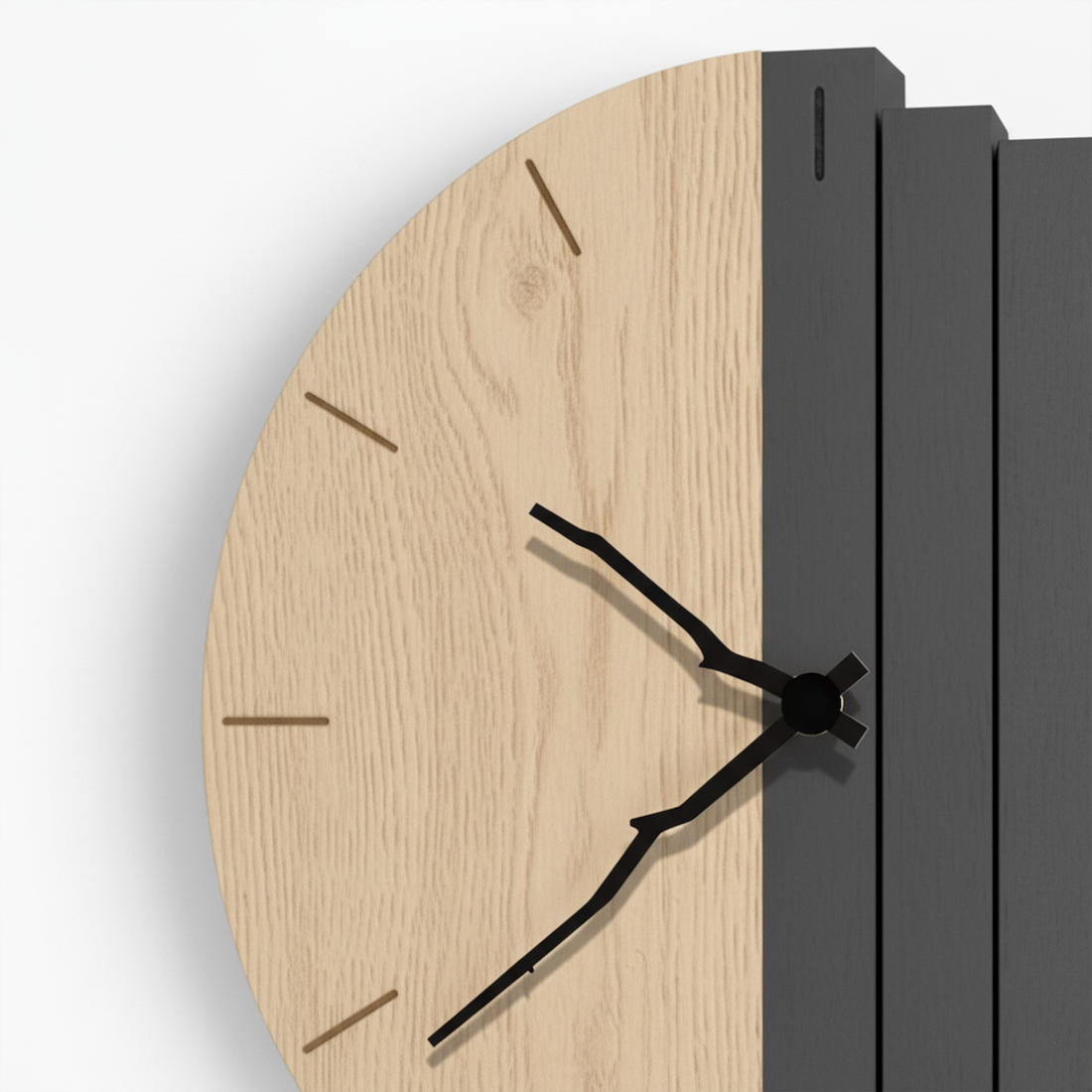Gefertigt aus hochwertigem Echtholz kombiniert mit markanten dunklen Elementen entsteht ein spannender Kontrast. Das Design erinnert an architektonische Formen und macht die Uhr zu einem Blickfang in modernen Wohnräumen.