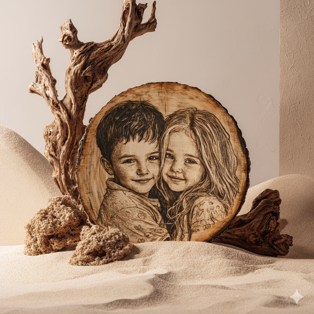 Auf einer massiven Baumscheibe entsteht aus deinem Foto eine fein ausgearbeitete Bildgravur, die durch die natürliche Struktur des Holzes an Tiefe gewinnt. Jede Linie, jeder Ton und jede Kontur wird von unseren Grafikern behutsam nachbearbeitet, damit dein Motiv so klar und lebendig wirkt, als würde es in den Jahresringen weiteratmen.