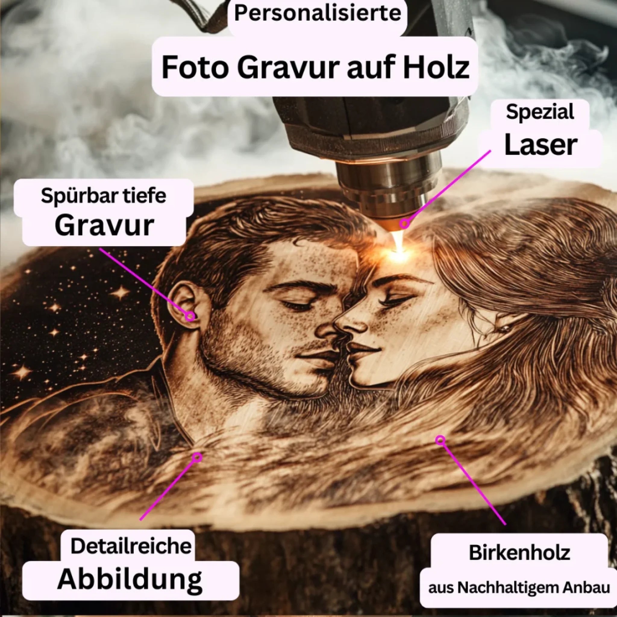 Unsere hochpräzise Gravurtechnologie ermöglicht gestochen scharfe Bilder. Mit modernster Lasertechnologie übertragen unsere erfahrenen Mitarbeiter Ihr Foto mit atemberaubender Präzision auf die Baumscheibe. Das Ergebnis ist eine beeindruckende Darstellung Ihrer Erinnerungen oder geliebten Menschen, eingebettet in das rustikale, natürliche Element der Baumscheibe.